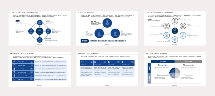 単なる「綺麗なスライド」ではありません。3C分析、SWOT、5フォースといった専門的な思考の枠組み(フレームワーク)を、そのままプレゼンに組み込める形で構造化しています。